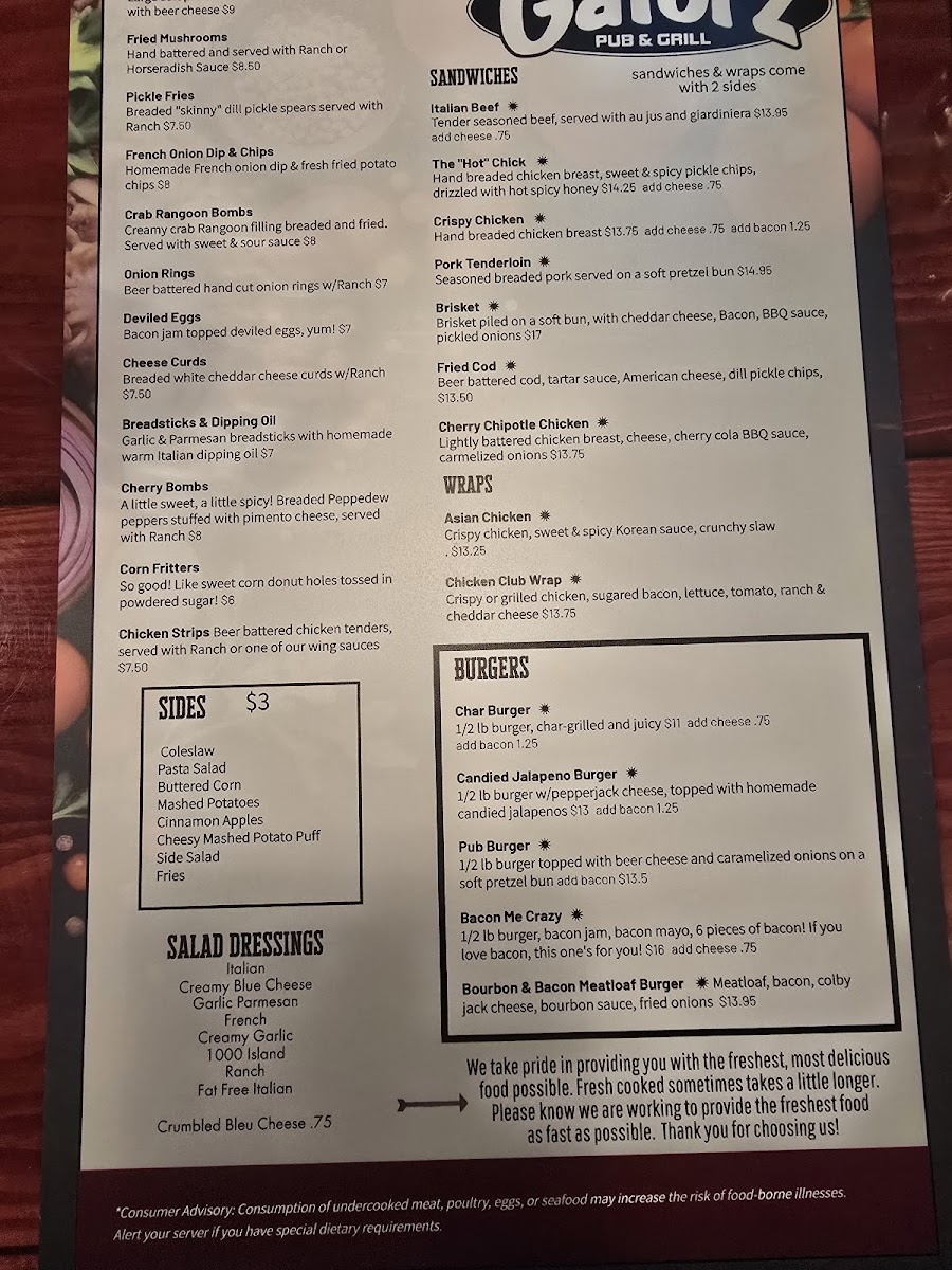 Gator'z Pub & Grill offers a hearty and well-rounded menu that satisfies both classic cravings and adventurous tastes. To kick things off, the Pretzel Sticks, Fried Mushrooms, and Pickle Fries make for crave-worthy starters, while the Crab Rangoon Bombs bring a fun twist to the appetizer game. Sandwich lovers can enjoy hearty options like the Italian Beef, The "Hot" Chick, or the juicy Brisket, while the Pork Tenderloin adds a Midwestern comfort touch.