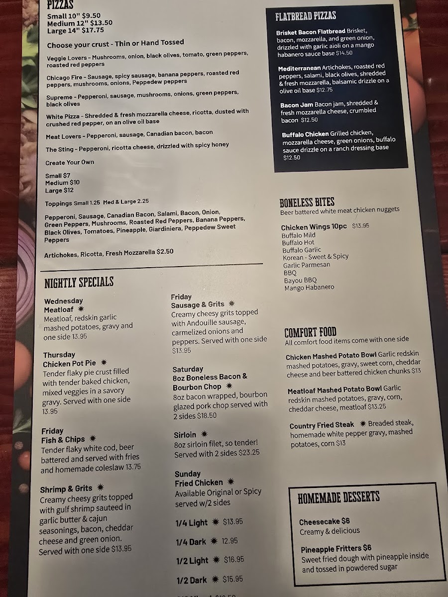 The daily specials keep things interesting with comforting Chicken Pot Pie on Thursdays, Fish & Chips and Shrimp & Grits on Fridays, and hearty entrees like the 8oz Boneless Bacon & Bourbon Chop and Sirloin on Saturdays. Traditional comfort food dishes such as the Chicken Mashed Potato Bowl, Meatloaf Mashed Potato Bowl, and Country Fried Steak add to the homey charm of the menu.